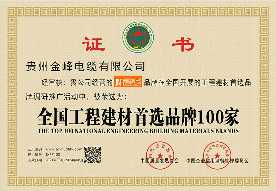 全國工程建材首先選品牌100家證書