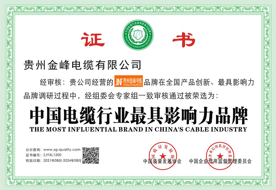 • 中國電纜行業最具影響力品牌證書